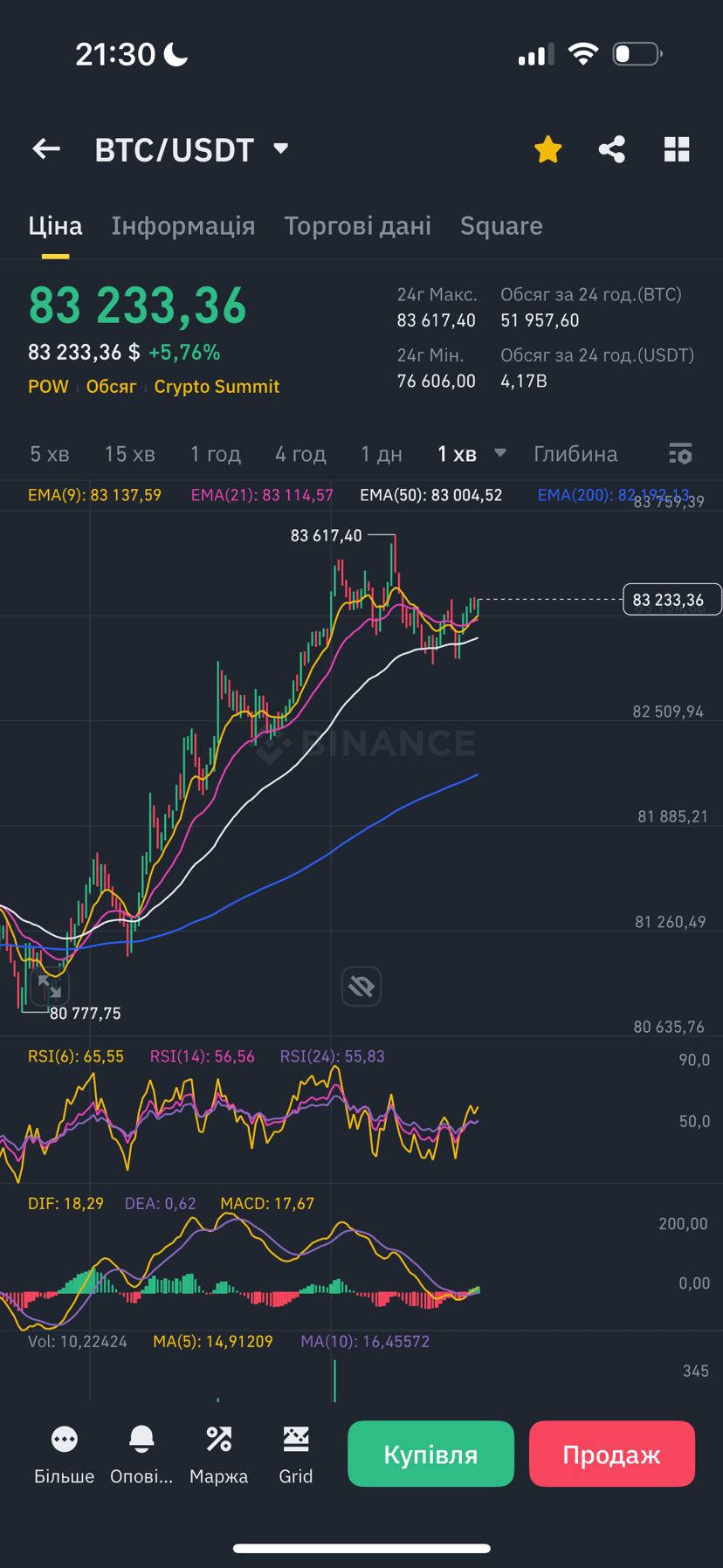 Auf dem 1-Minuten-Chart ist ein kurzfristiger Aufwärtstrend zu sehen – der Preis steigt, EMA(9) und EMA(21) bestätigen den Momentum, der RSI befindet sich im neutralen Bereich. Auf einem solchen Zeitrahmen können Trader schnelle Schwankungen sehen und Geschäfte für einige Minuten oder Stunden eröffnen. Es ist wichtig zu beachten, dass solche Bewegungen kein langfristiges Wachstum garantieren, und der Preis kann sich abrupt ändern.
