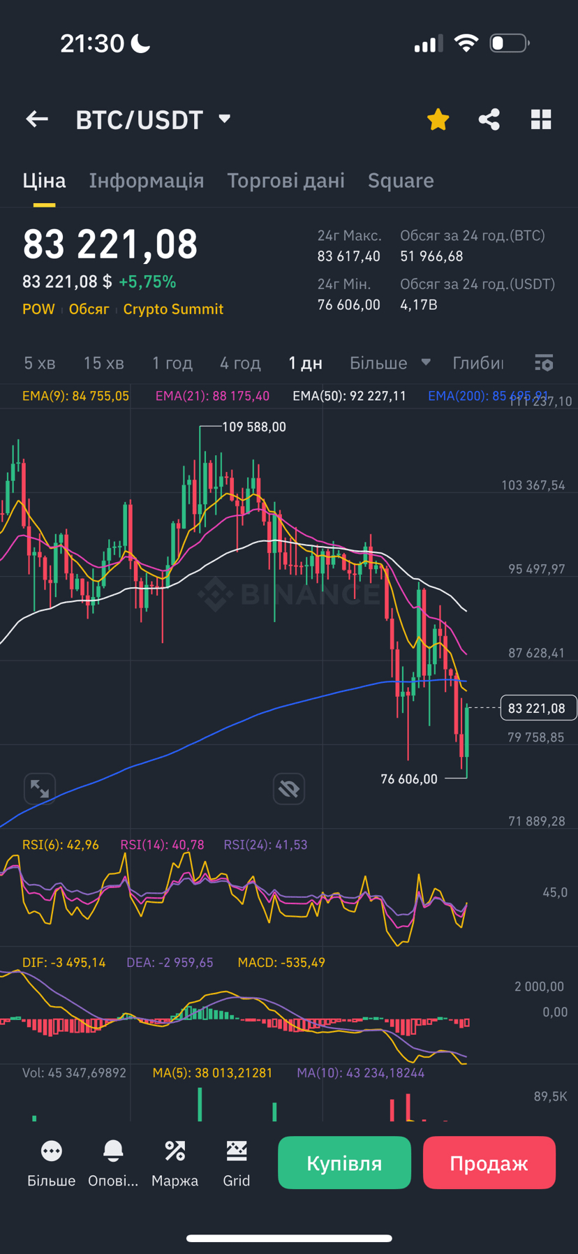 Auf dem 1-Tages-Chart ist die Situation ganz anders – ein Abwärtstrend nach dem lokalen Minimum von 76.606 $. BTC ist nach oben abgeprallt, aber EMA(9) und EMA(21) zeigen weiterhin Schwäche. Der RSI liegt im Bereich von 40-50, was auf Unsicherheit hinweist – es gibt noch keine klaren Signale für eine Umkehr, aber auch die Verkäufer verlieren an Impuls.