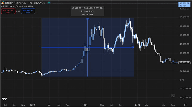 Im Jahr 2020 fiel BTC auf 5.000 $, erreichte aber dann im Jahr 2021 ein ATH von über 69.000 $.