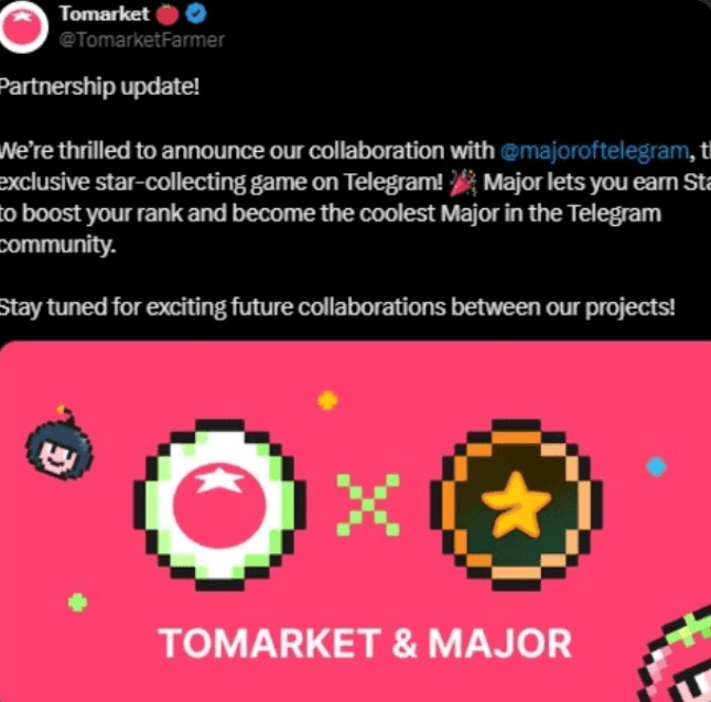 Am 12. September gab Tomarket eine strategische Partnerschaft mit Major Coin bekannt, dem exklusiven Star-Collecting-Spiel auf Telegram. Diese Zusammenarbeit stellt einen bedeutenden Meilenstein dar, da Major Coin die Spieler mit Sternen belohnt, um ihre Ranglisten zu erhöhen, wodurch sie sich als prominente Figuren innerhalb der Telegram-Community etablieren können.