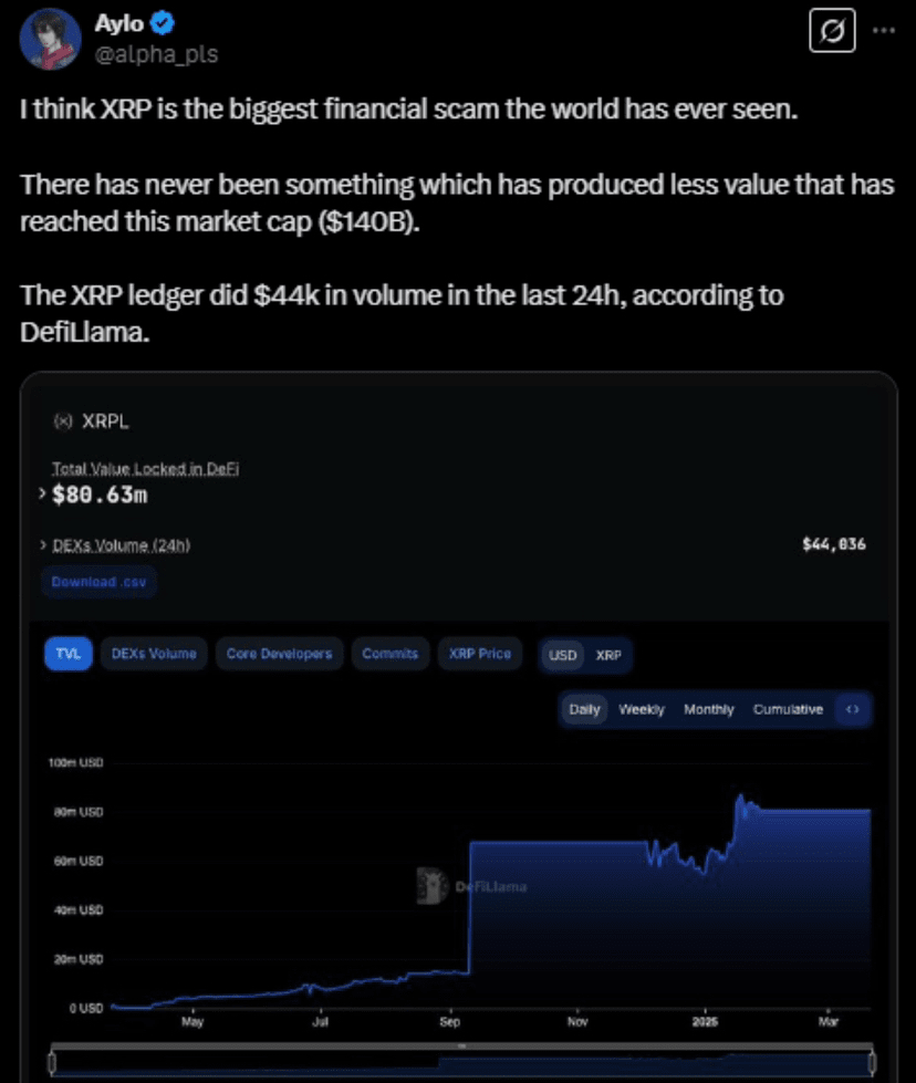 Die Behauptung stammt von einem Forscher namens Aylo, der das XRP Ledger (XRPL) kritisierte, weil es angeblich nur 44.000 $ im dezentralen Handel (DEX) über einen Zeitraum von 24 Stunden hatte, während XRP zu diesem Zeitpunkt eine Marktkapitalisierung von etwa 140 Milliarden $ aufwies. Aylo, der mit der Blockchain-Ressource Alpha Please verbunden ist, argumentierte, dass dieses niedrige DEX-Volumen darauf hindeutet, dass XRP wenig greifbaren Wert geschaffen hat, und nannte es unverhältnismäßig für ein Asset seiner Marktgröße. Er untermauerte seinen Punkt mit einem Snapshot von DeFiLlama, der nahelegt, dass eine solche minimale Handelsaktivität die Legitimität und Nützlichkeit von XRP untergräbt. 📉💰