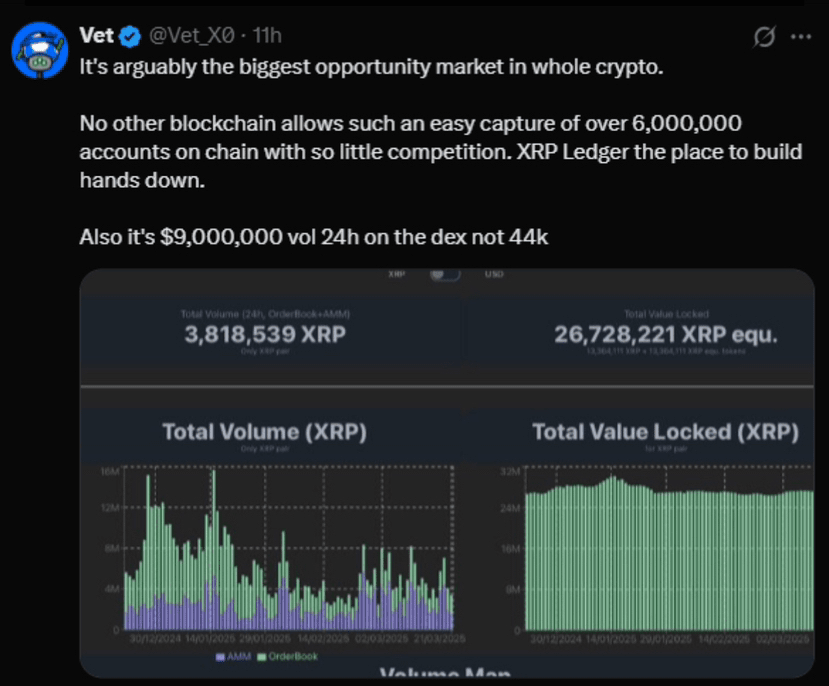 Der Chief Technology Officer von Ripple, David Schwartz, antwortete, indem er klarstellte, dass die 44.000 $ wahrscheinlich nur die Aktivität von Automated Market Makers (AMMs) auf dem XRPL widerspiegeln, die er als einen winzigen Bruchteil der gesamten Nutzung von XRP beschrieb. Schwartz deutete an, dass die Daten des Forschers nicht den vollen Umfang der Aktivität von XRP erfassten, da sich das XRPL historisch auf grenzüberschreitende Zahlungen und nicht auf DeFi konzentriert hat. ⚡🔍 Darüber hinaus wies ein Validator namens Vet Aylo’s Behauptung zurück und behauptete, dass das tatsächliche DEX-Volumen über 24 Stunden näher bei 9 Millionen $ lag, wenn man AMM- und Central Limit Order Book (CLOB)-Zahlen kombiniert, obwohl es immer noch niedriger ist als bei Wettbewerbern wie Ethereum oder Solana. Vet stellte auch fest, dass das DeFi-Ökosystem von XRPL noch in der Entwicklung ist, da es erst im März 2024 die AMM-Funktionalität integriert hat. 🚀📊