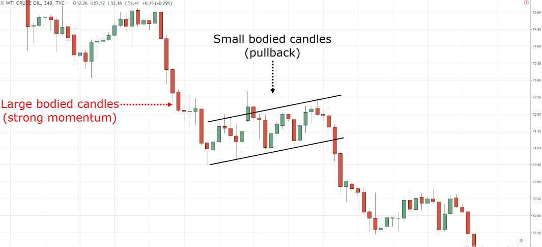 👉 Suche nach einem starken Abwärtstrend, gefolgt von einem engen Rückzug in aufsteigender Richtung.