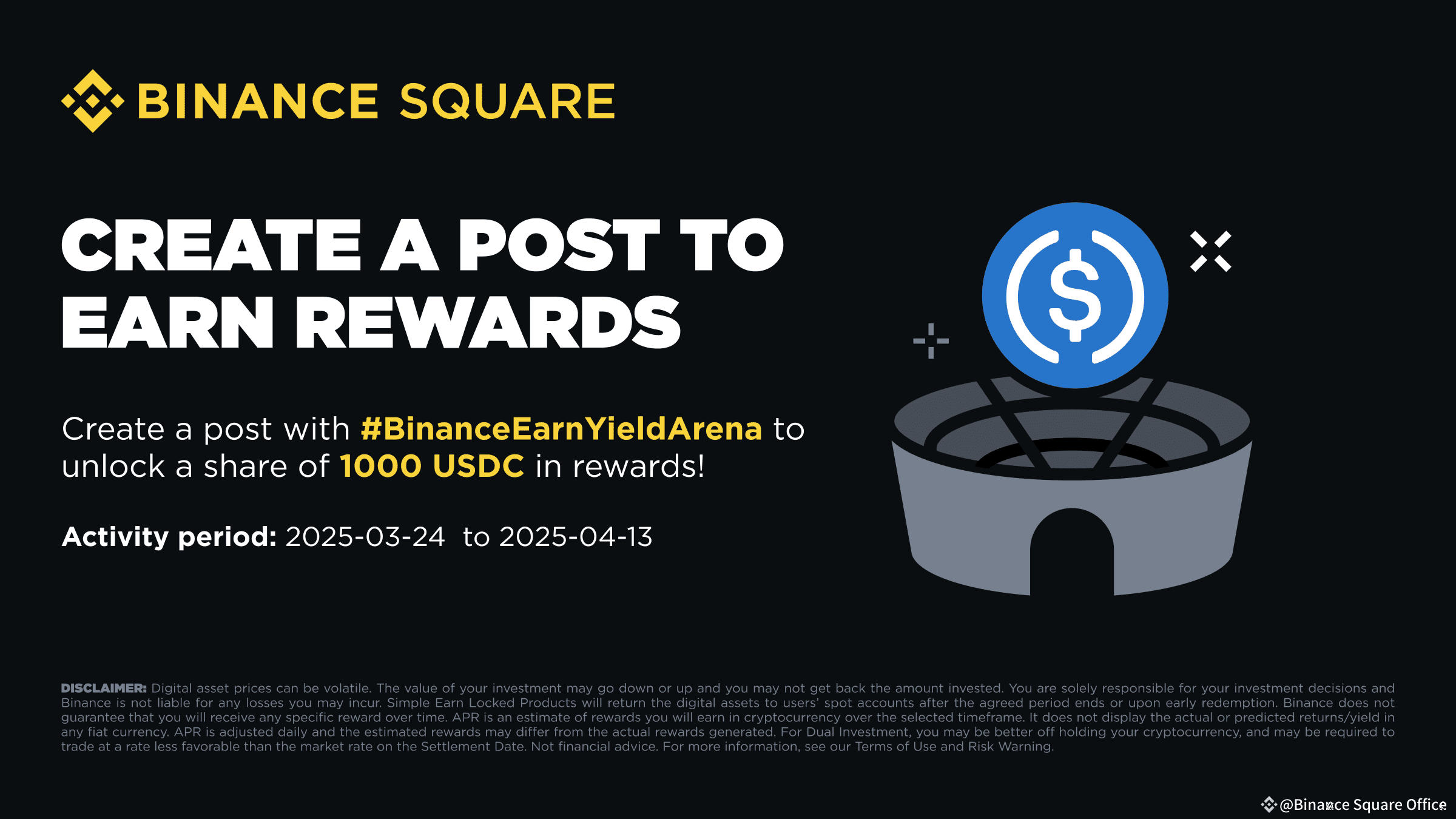 Erstellen Sie einen Post mit #BinanceEarnYieldArena, um Binance-Punkte zu verdienen und sich einen Anteil von 1000 USDC an Belohnungen zu sichern! Berechtigte Posts müssen mindestens 100 Zeichen und maximal 1 Hashtag enthalten. Alle berechtigten Posts teilen sich gleichmäßig 1.000 USDC Token-Gutscheine, begrenzt auf 5 $ pro Teilnehmer.