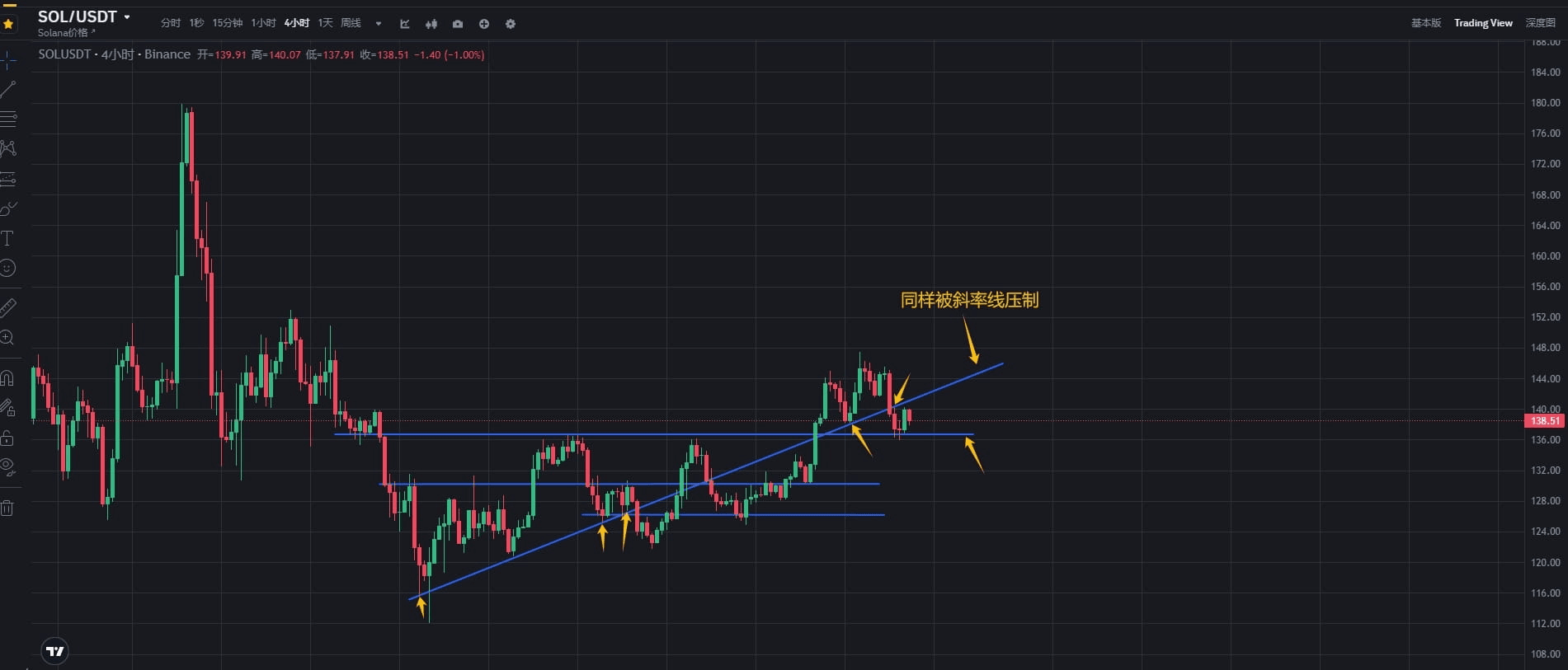 Ethereum testet kontinuierlich die Unterstützungs- und Widerstandsniveaus, und derzeit ist die Rückprallstärke nicht signifikant. Wenn es wiederholt von der Aufwärtsneigung unter Druck gesetzt wird und unter die gelbe Linie nach unten bricht, ist die Wahrscheinlichkeit, dass eine neue Korrektur beginnt, relativ hoch.