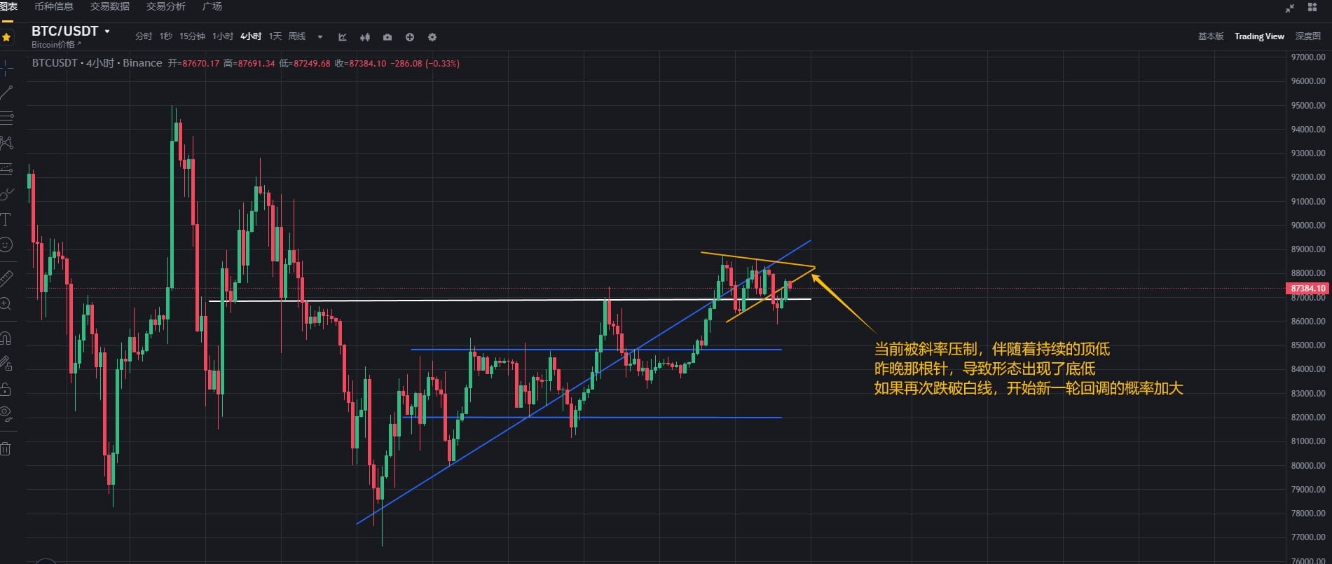 Wenn Bitcoin gestern kein 4-Stunden-Tief gesetzt hätte, würde das Muster viel besser aussehen. Es steht derzeit unter Neigungsdruck und kann nicht über die Neigung zurückkehren, während es auch von tieferen Tiefs begleitet wird. Die Bullen sind jedoch immer noch präsent; dieser lange untere Schatten beweist es.