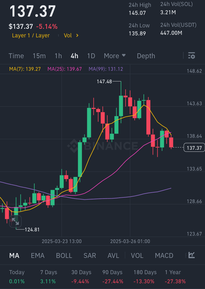 Wenn man sich das 4-Stunden-Diagramm ansieht, hat SOL kürzlich einen Höchststand von 147,48 $ erreicht, ist jetzt aber auf 137,37 $ gefallen. Dieser Rückgang ist ein Segen in Verkleidung, eine Gelegenheit für diejenigen, die das Spiel wirklich verstehen. Die gleitenden Durchschnitte (MA7 & MA25) deuten auf einen starken Aufwärtstrend nach dieser kleinen Korrektur hin. Der Markt atmet nur, bevor es zum nächsten Anstieg kommt!