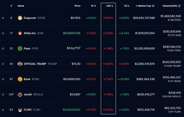 DOGE und PEPE sind um etwa 7 % gefallen, FLOKI ist um 9 % gefallen, und einige wie SPX wurden sogar härter getroffen und sind um über 13 % gefallen.