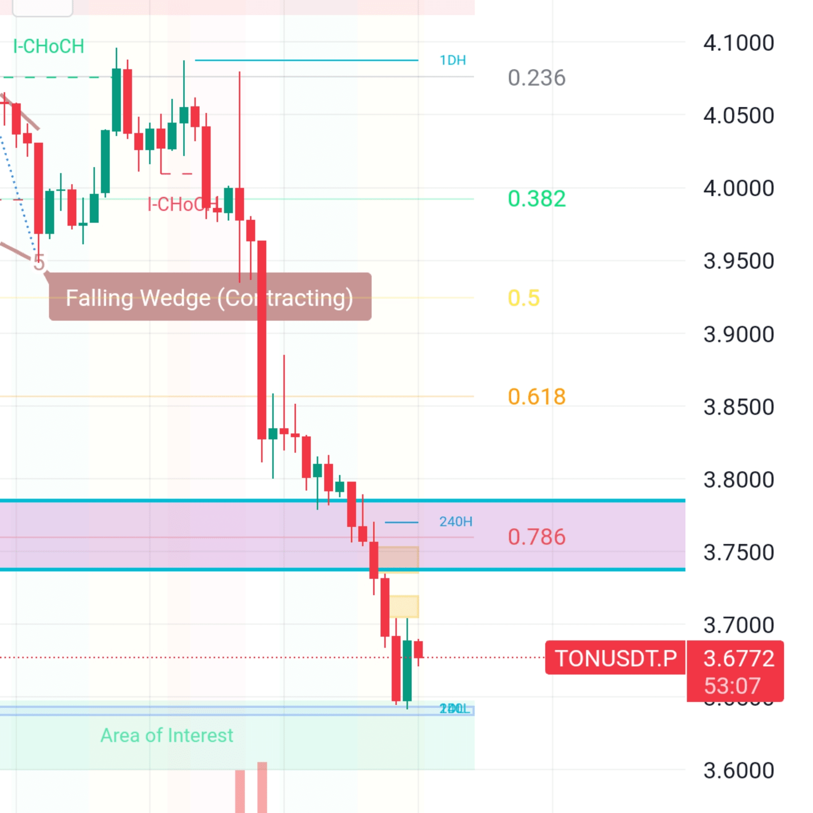 TON befindet sich in einem starken Abwärtstrend und bildet kontinuierlich niedrigere Hochs und niedrigere Tiefs.