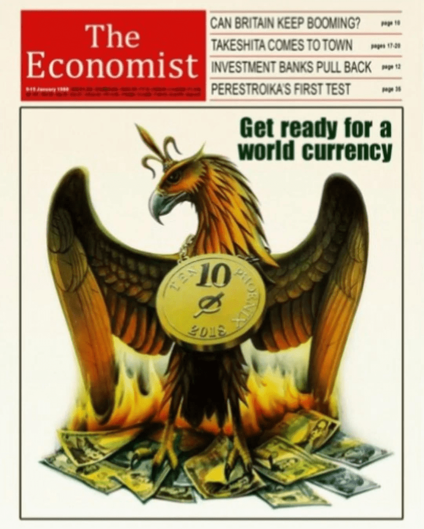 Das Cover von 1988 mit dem Phönix, der physische Währungen verbrennt, und der Erwähnung einer "Weltwährung" ist ein ziemlich eindringliches Bild. Es ist jedoch wichtig zu beachten, dass Bitcoin 1988 noch nicht existierte. Die Idee einer Weltwährung ist seit Jahrzehnten ein Thema in wirtschaftlichen und geopolitischen Kreisen. Es könnte potenziell auf Konzepte wie die Entwicklung eines einheitlicheren globalen Währungssystems hinweisen, möglicherweise in Form einer stärkeren Integration der bestehenden Hauptwährungen oder der Schaffung einer supranationalen Währungseinheit.
