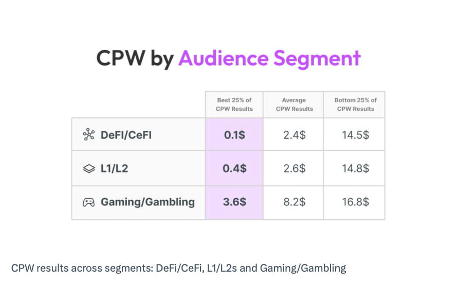 Unterdessen haben dezentrale Finanzen (DeFi) und zentralisierte Finanzen (CeFi) es viel einfacher, neue Krypto-Nutzer zu gewinnen. „DeFi/CeFi-Kampagnen sind die kosteneffizientesten, mit einem Median-CPW von 2,79 $ und einem unteren Quartil von nur 0,10 $“, sagte Nadler.