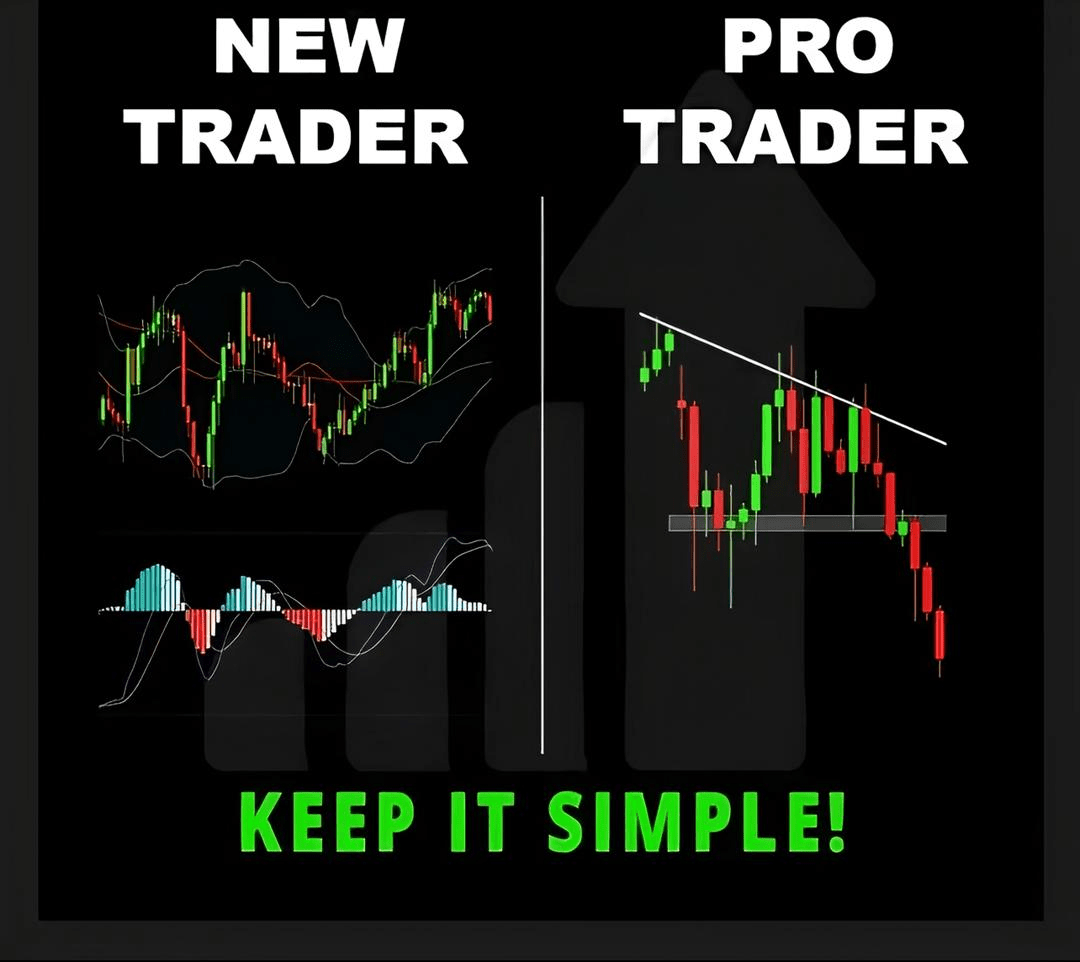 Dieses Bild kontrastiert neue Händler und Profi-Händler. Neue Händler überladen oft Charts mit vielen Indikatoren wie MACD, Bollinger-Bändern und gleitenden Durchschnitten, was zu Verwirrung und Überanalyse führen kann. Profi-Händler hingegen verwenden einen einfachen, klaren Ansatz – sie konzentrieren sich auf Preisbewegungen, Trendlinien und Unterstützungs-/Widerstandsniveaus. Das Bild betont, dass professionelle Händler sich auf klare Strukturen wie Ausbrüche aus Trendlinien oder Unterstützungszonen verlassen. Die Kernbotschaft: Einfachheit führt zu Klarheit und besseren Handelsentscheidungen. „Halte es einfach“ ermutigt Händler, eine Überlastung mit Indikatoren zu vermeiden und sich darauf zu konzentrieren, was der Preis ihnen tatsächlich durch grundlegende technische Analyse mitteilt.