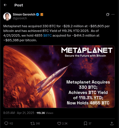 Das in Tokio ansässige Unternehmen Metaplanet hat die Hinzufügung von 330 BTC zu seinen wachsenden Bitcoin-Beständen angekündigt. Laut einem Post auf X von Metaplanet CEO Simon Gerovich gab das japanische Unternehmen 28,2 Millionen Dollar für den Kauf aus.