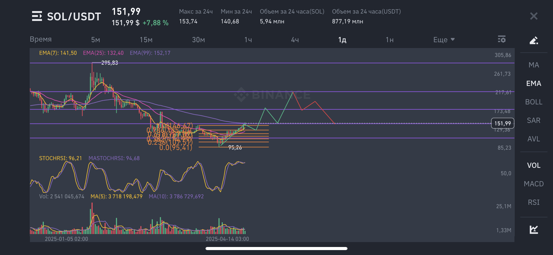 1. Technischer Konsolidierungsbereich und Ausbruch nach oben. Auf dem Chart ist die Bildung einer Akkumulation im Bereich von 95–150 USDT zu sehen, wonach der Preis eine sichere Bewegung nach oben begann. Die Marke 151–152 wird durchbrochen, was der Startpunkt für einen Aufwärtsimpuls sein könnte.