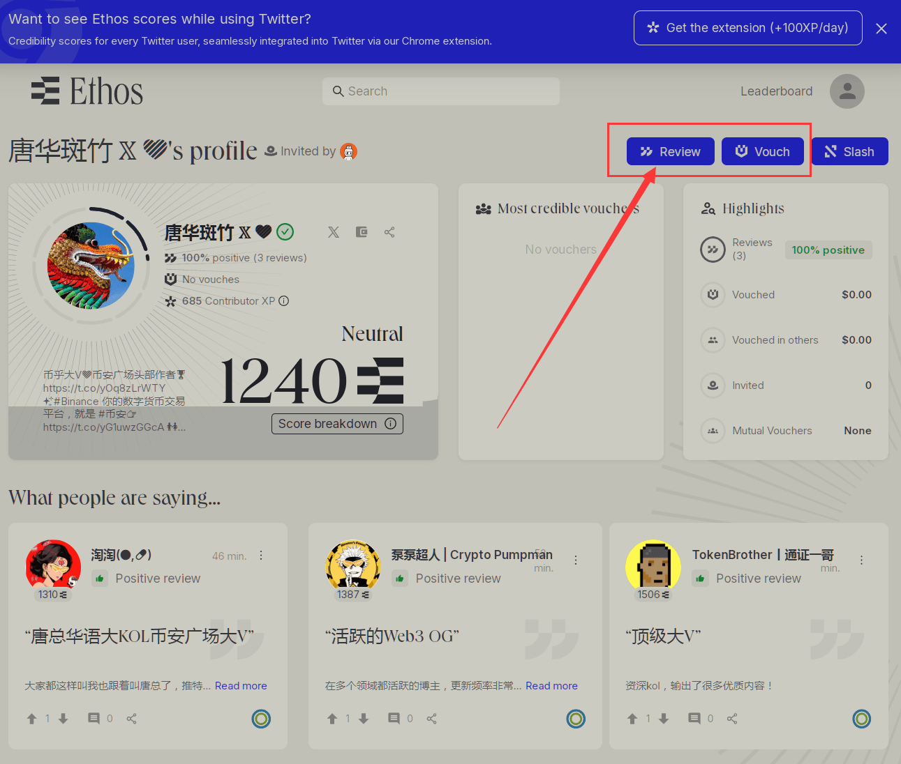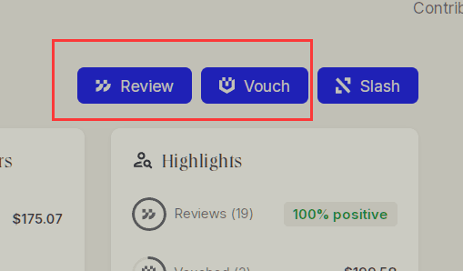 Nach dem Betreten klicke auf das Bild unten auf "Review" und "Vouch". "Review" ist eine Bewertung meiner Person, dann sehe ich, wer mich bewertet hat, und bewerte auch andere, so erhalten beide XP-Punkte. Was "Vouch" betrifft, so ist das das Staken von ETH zur gegenseitigen Absicherung, das betrifft Geld, also kann man es lassen, man kann sich nur gegenseitig bewerten. Jeder ist willkommen zu bewerten, ich werde auf jeden Fall zurückbewerten, den ich sehe.