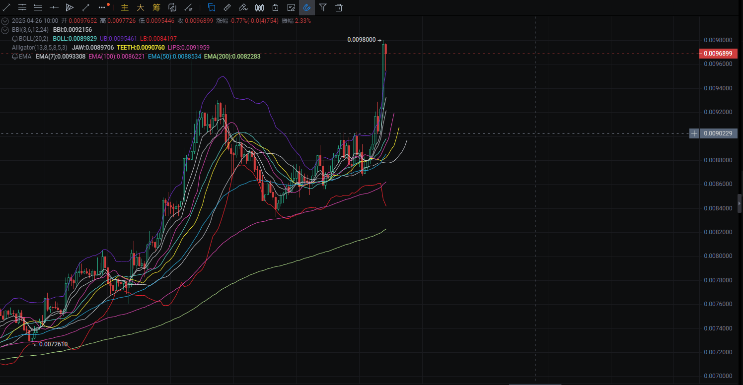 Am 25. April zog PEPE nach dem Durchbruch der 0.0090-Marke stark an, aber der obere Schatten verlängerte sich, die Tageslinie schloss mit einer kleinen roten Kerze, was auf starken Druck von oben hinweist.