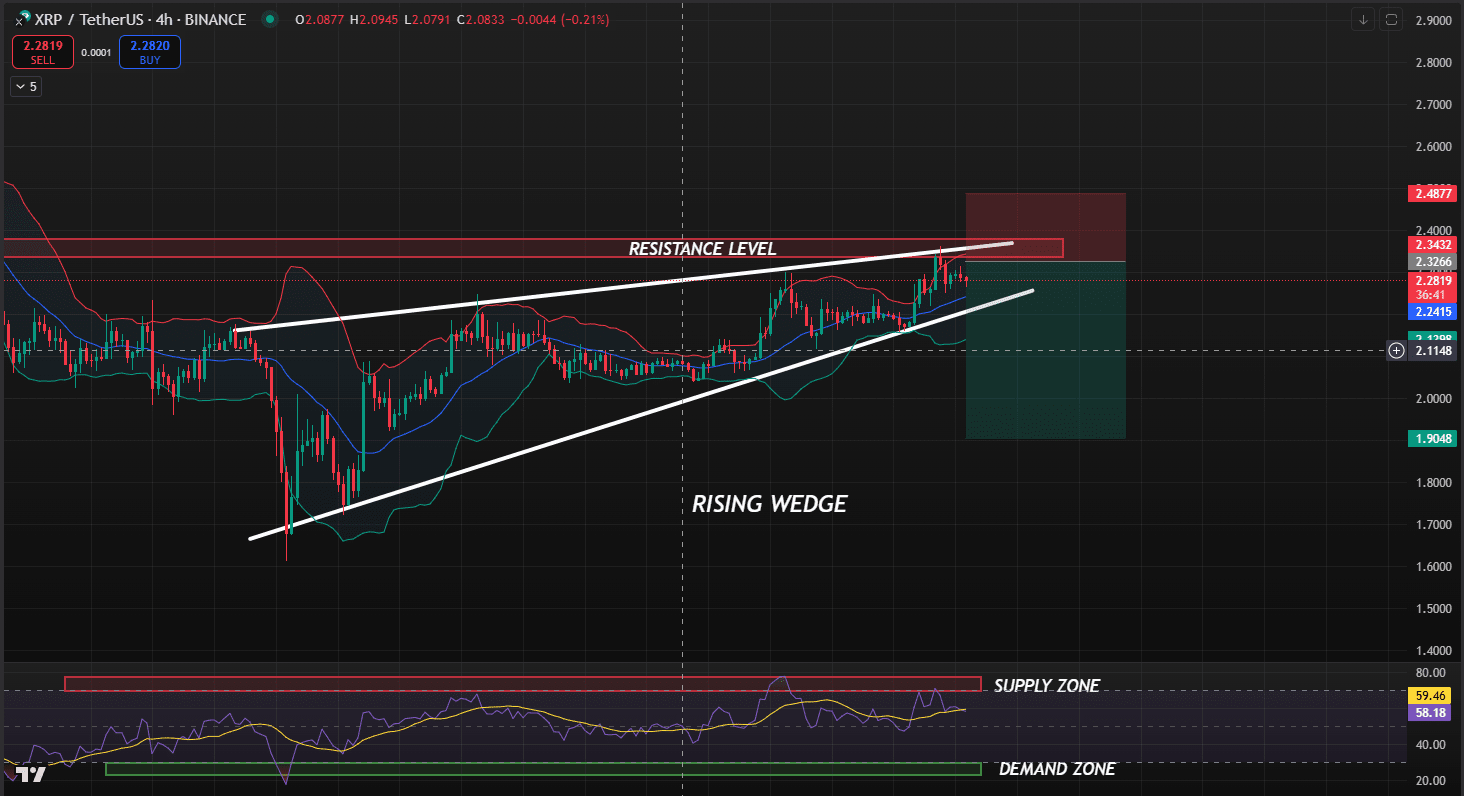 Im 4-Stunden-Chart scheint XRP ein steigendes Keilmuster zu bilden, was typischerweise ein bärisches Signal ist. Ein Durchbruch unter die Unterstützungstrendlinie des Keils könnte eine Bewegung in Richtung meines Zielniveaus auslösen. Darüber hinaus hält sich der RSI derzeit in der Angebotszone, was meine bärische Sicht auf XRP verstärkt.
