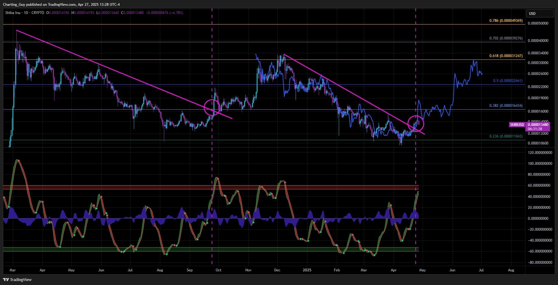 Nach diesem Ausbruch und Preissprung bildete sich eine weitere absteigende Trendlinie, als der Verkaufsdruck bis ins Jahr 2025 anhielt. Allerdings durchbrach SHIB Mitte April 2025 diesen zweiten Widerstand, was auf eine mögliche Verschiebung in den Marktdynamiken hindeutet.