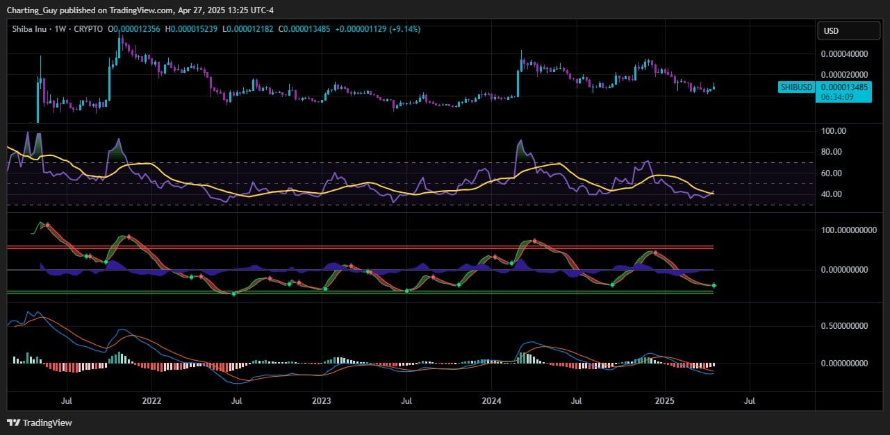 Inzwischen lieferte eine separate Analyse von Charting Guy weitere Einblicke anhand des wöchentlichen SHIB/USD-Diagramms. Drei Schlüsselindikatoren – der RSI, WaveTrend-Oszillator und LMACD – zeigen frühe Anzeichen von bullischen Umkehrmustern.