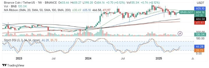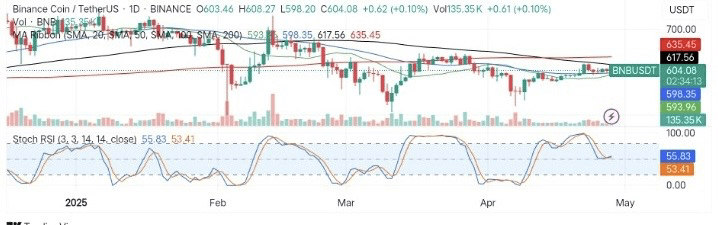 Im Tageschart konsolidiert BNB/USDT gerade über 593 $ und 598 $, wo sich die 20- und 50-Tage-SMAs befinden, was auf eine kurzfristige Aufwärtsbewegung hindeutet. Das Verhalten des Preises unter den längerfristigen SMAs deutet jedoch auf einen engen Widerstandscluster hin.