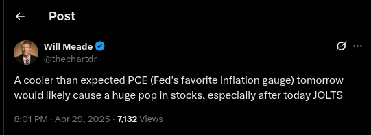 Analyst Will Meade äußerte dieses Gefühl ebenfalls und schlug über Twitter vor, dass eine niedrigere als erwartete PCE-Inflationsrate zu einem Anstieg der Aktienkurse führen könnte, was auch wahrscheinlich den Bewertungen von Kryptowährungen zugutekommen würde.