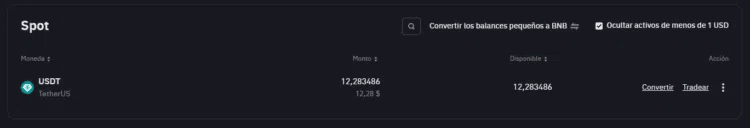 Sobald Sie über ein verfügbares Guthaben verfügen, gehen Sie zum Abschnitt „Wallets“ von Binance und wählen Sie „Spot“. Suchen Sie dort den Vermögenswert, den Sie umwandeln möchten (zum Beispiel USDT oder BTC), und klicken Sie auf „Umwandeln“.