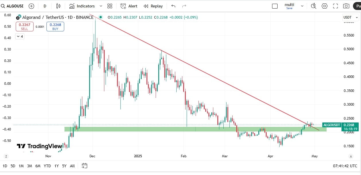 ALGO/USDT befindet sich in einem Abwärtstrend, wie die fallende Trendlinie im Tageschart zeigt. Nach einer starken Rally im Dezember 2024 stieß der Preis an der Trendlinie auf Widerstand und hat sich seitdem in einer Unterstützungszone um $0.2268 - $0.2000 konsolidiert. Der aktuelle Preis von $0.2268 testet diese wichtige Unterstützung. Ein Durchbruch unterhalb dieser Zone könnte zu weiterem Abwärtspotenzial führen, während ein Abprall eine kurzfristige Erholung in Richtung des Widerstands bei $0.3000 signalisieren könnte.