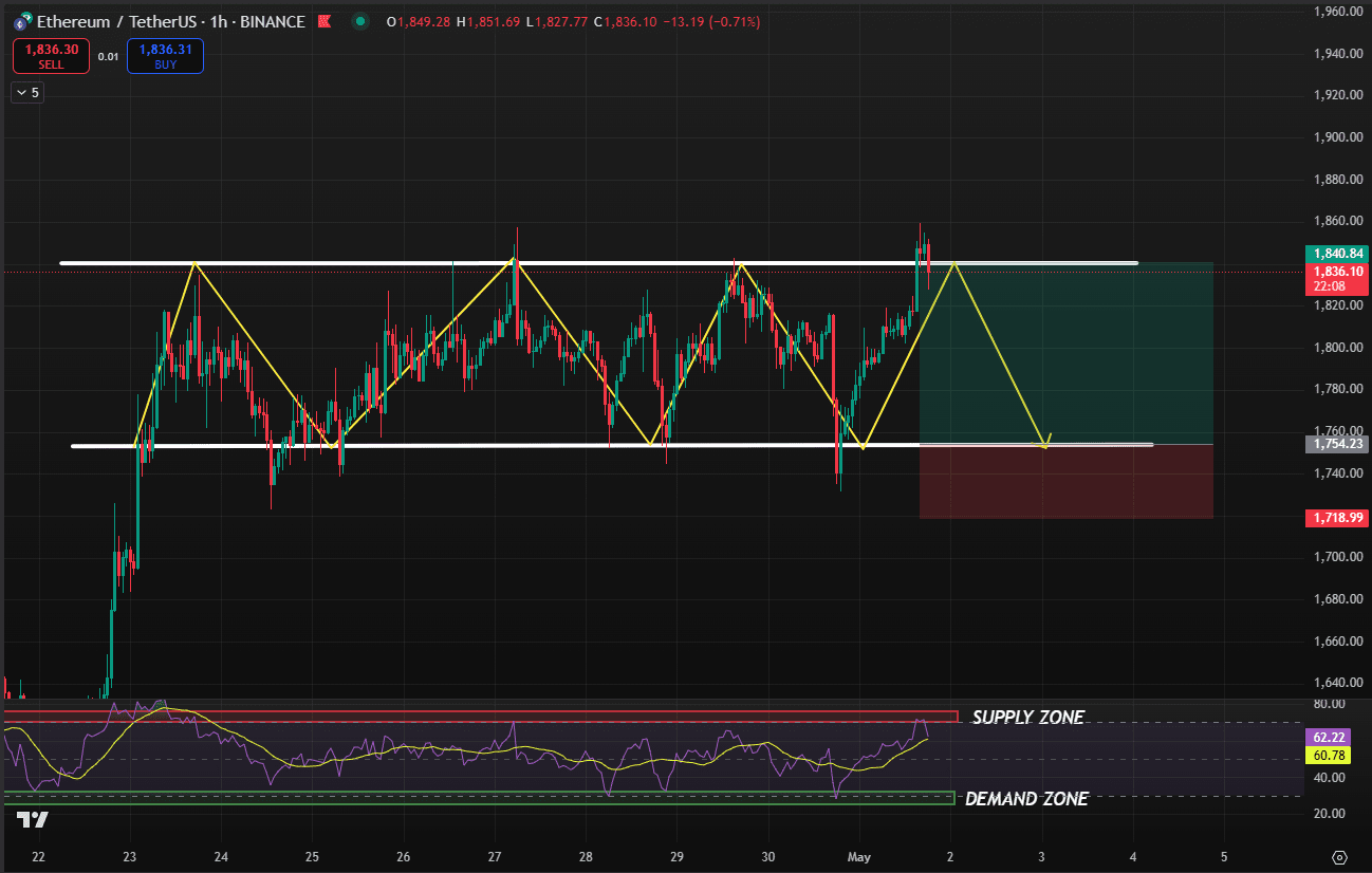 ETH konsolidiert zwischen zwei Trendlinien im 4-Stunden-Zeitrahmen. Ein Ausbruch über die obere Trendlinie, gefolgt von einem sauberen Retest, könnte einen soliden Long-Einstieg bieten. Da der RSI jedoch die Angebotszone getestet hat und jetzt zurückzieht, bleibe ich vorerst leicht bärisch. Wenn Sie möchten, können Sie eine Limit-Order um die 1750-Dollar-Marke setzen.