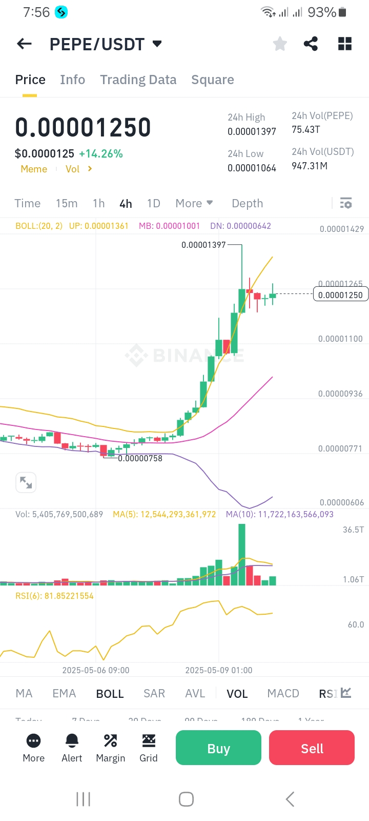 🟢Der Preis von Pepe 🐸($PEPE ) beträgt heute $0.00001247 mit einem Handelsvolumen von $4.024.921.400 in 24 Stunden.