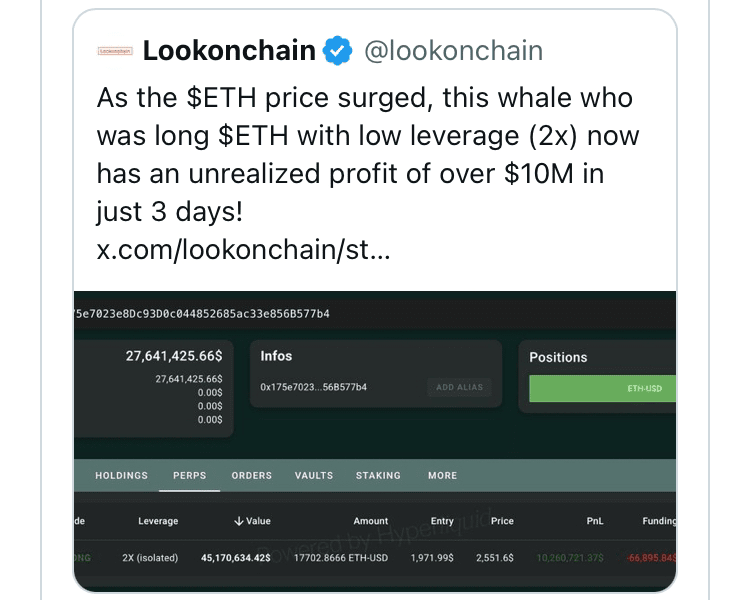 Die Strategie des Wals bei Ethereum entfaltet sich früh in der Rallye, als ETH von etwa 1.800 Dollar auf über 2.500 Dollar innerhalb von weniger als einer Woche stieg. Bis zum 11. Mai bestätigte Lookonchain, dass die Long-ETH-Position des Händlers einen erheblichen unrealisierbaren Gewinn von über 10 Millionen Dollar erzielt hatte.