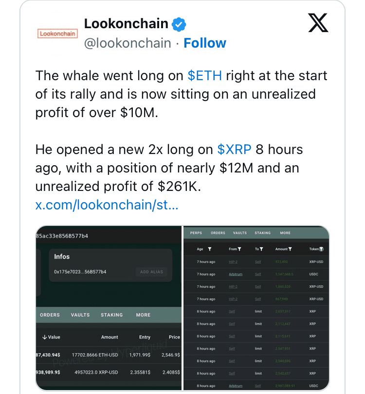 Laut Daten des Blockchain-Analyseunternehmens Lookonchain hat der Wal zuerst von der Rallye von Ethereum Anfang Mai 2025 profitiert und über 10 Millionen Dollar an unrealisierbaren Gewinnen gesichert. Der Fokus hat sich jedoch auf XRP verschoben, da dasselbe Unternehmen kürzlich eine Long-Position von 12 Millionen Dollar in dem Vermögenswert initiiert hat.