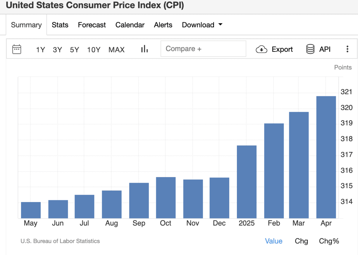 Bitcoin erholte sich am Montag nach der Veröffentlichung des US-Verbraucherpreisindex (VPI) für April deutlich. Laut Daten von Trading Economics stieg der US-Verbraucherpreisindex (VPI) im April von 319,8 Punkten im März 2025 auf 320,80 Punkte.