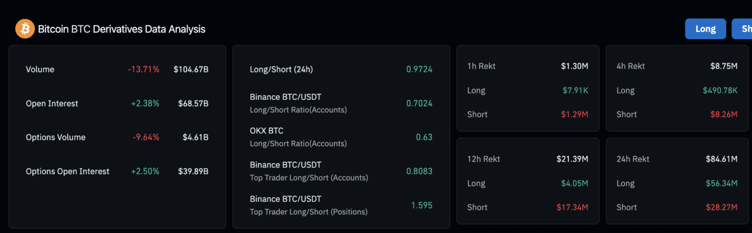 Das Open Interest bei Bitcoin-Futures stieg um 2,38 Prozent auf 68,57 Milliarden Dollar. Das Open Interest bei Optionen stieg um 2,50 % auf 39,89 Milliarden Dollar.