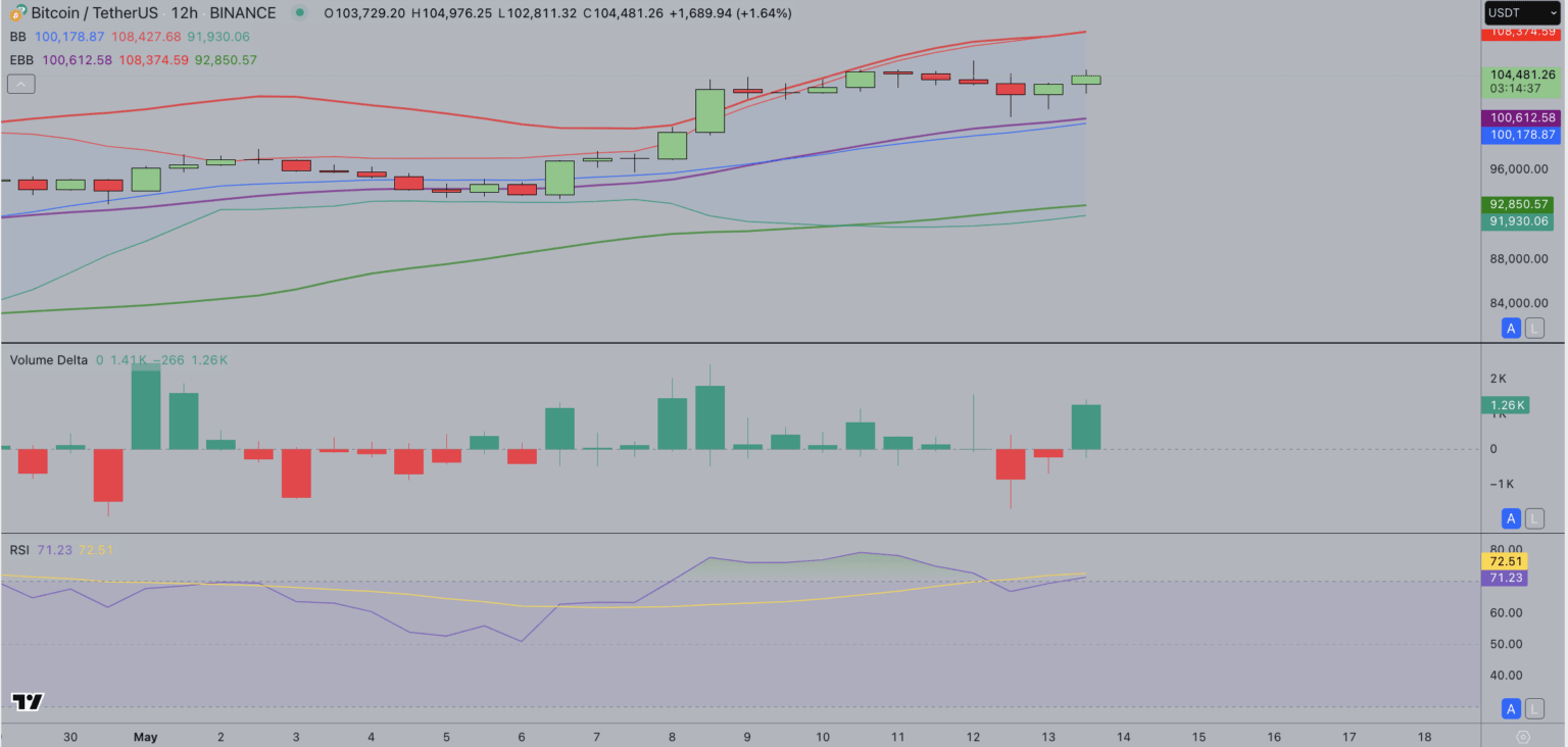 Wie in der untenstehenden Trading-View-Grafik zu sehen ist, wird Bitcoin bei 104.560 Dollar gehandelt, nachdem er in der letzten 12-Stunden-Sitzung fast 18 % zugelegt hat, was auf eine bullische Erholung nach einer Konsolidierungsphase hindeutet.
