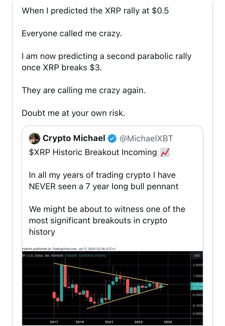 In der Zwischenzeit hat Crypto Michael, bekannt als der "Swing King", eine Analyse präsentiert, die einen ähnlichen Anstieg über 3 $ prognostiziert. In einem parallelen Tweet erwähnte er auch den Unglauben einiger Marktteilnehmer, als er zuvor einen Preisanstieg von XRP auf 0,5 $ vorhersagte.