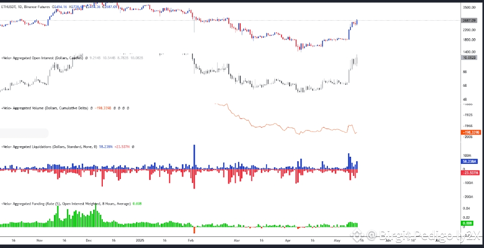 IndicadorEstadoComentarioOpen interestEn aumentoActividad especulativa en crecimiento, mostrando un aumento del interésCVDAbsorción vendedoraDivergencia que muestra la presencia de vendedores, absorbidos por compradores pasivosLiquidaciónFuerte, del lado cortoLiquidaciones notables en posiciones cortas, signo de capitulación de vendedores.Tasa de financiamientoligeramente positivaTasa de financiamiento moderadamente alta, señalando un sesgo alcista sin exceso marcado de especulación.