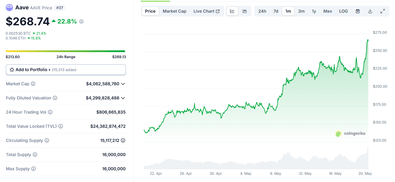 Der AAVE-Token ist in die Höhe geschossen und hat innerhalb eines Tages über 25% zugelegt, handelt jetzt bei einem Monatshoch von über 268 Dollar – und das könnte erst der Anfang sein.