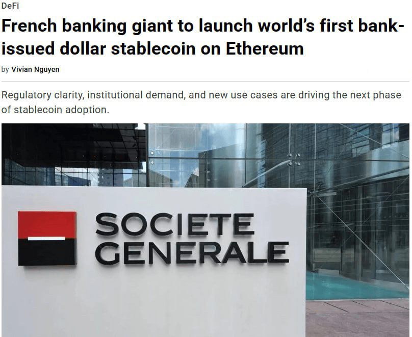 Der Finanzgigant Société Générale (Verwaltete Vermögenswerte – 166 Milliarden US-Dollar) startet den ersten Dollar-Stablecoin auf der Blockchain🪙ETH. Dieser Schritt macht das Unternehmen zur ersten großen Bank, die einen Stablecoin auf einem öffentlichen Blockchain-Netzwerk herausgibt👏