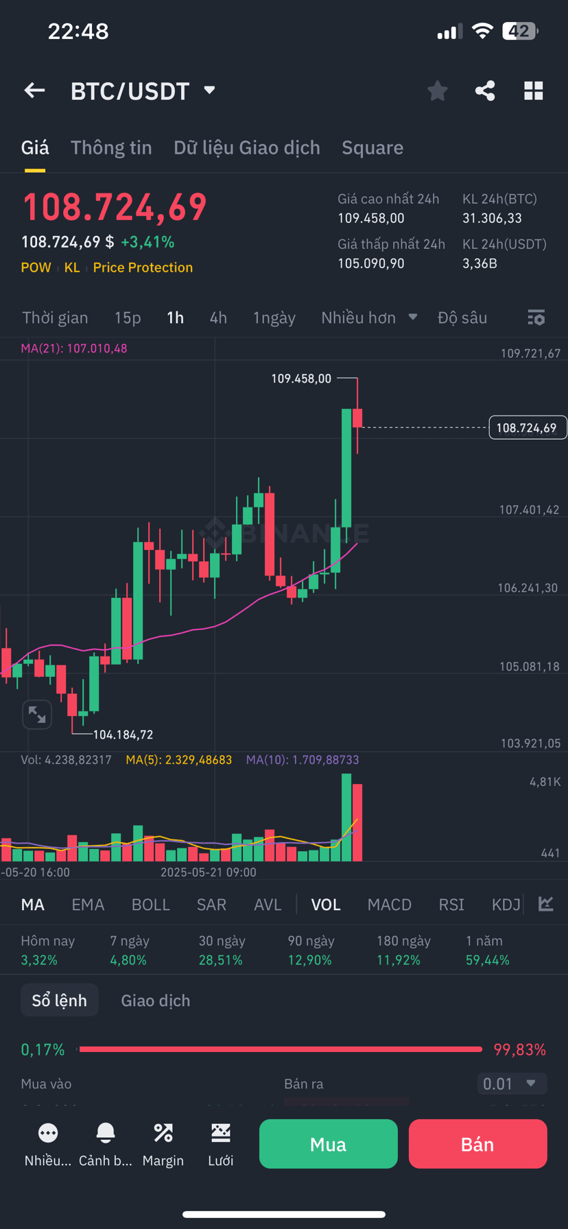 Bitcoin (BTC) hat gerade einen Meilenstein erreicht: hält über 100,000 USDT, +5,77% in 24h (Stand 21/05/2025, 22:53 GMT+7). Nach dem Ausbruch am 09/05 wird dieser Preisanstieg durch positive makroökonomische Nachrichten, Aktivitäten von institutionellen Walen und weit verbreitete FOMO getrieben. Wird dieser Anstieg nachhaltig sein – oder nur ein "blitzartiger Effekt"?