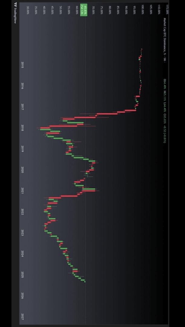 Dominanz von Bitcoin nach Marktkapitalisierung (2014–2025). Nach starken Rückgängen in 2018 und 2021, die mit Altcoin-Saisons zusammenfielen, hat Bitcoin 2025 eine Dominanz von etwa 65 % zurückgewonnen, was ein Höchststand in mehreren Jahren ist.