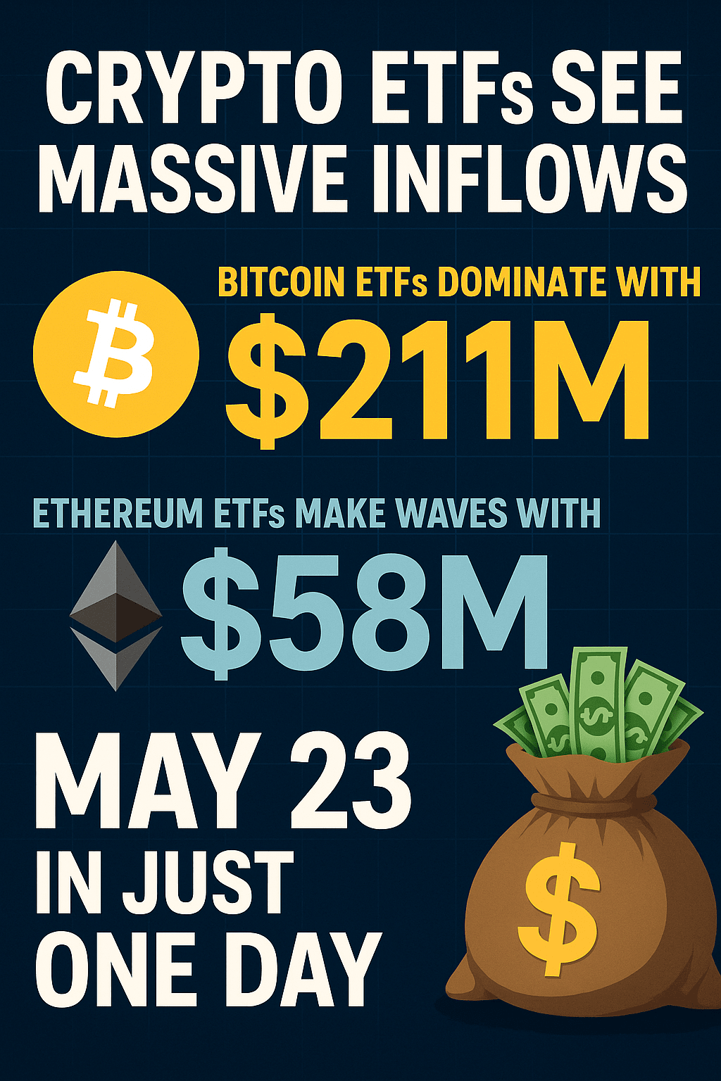 Am 23. Mai gab es einen Anstieg der Krypto-ETF-Investitionen, wobei Bitcoin (BTC) und Ethereum (ETH) Fonds groĂes Geld anlockten đ°. Bitcoin-ETFs fĂźhrten die Charge mit 211,74 Millionen USD an NettozuflĂźssen an, während Ethereum-ETFs mit 58,63 Millionen USD folgten. Dieser Anstieg spiegelt das wachsende institutionelle Vertrauen wider đŚ, da Investoren an nur einem Tag 1.900 BTC und 22.000 ETH aufkauften!