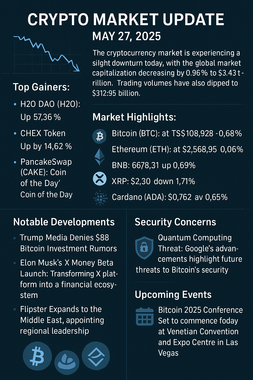 Der Kryptowährungsmarkt verzeichnet heute einen leichten Rückgang, da die globale Marktkapitalisierung um 0,96 % auf 3,43 Billionen $ gesunken ist. Auch die Handelsvolumina sind auf 312,95 Milliarden $ gesunken.
