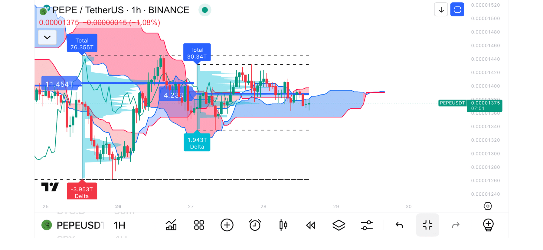 • Short-Einstieg im Bereich $0.00001375 – $0.00001390