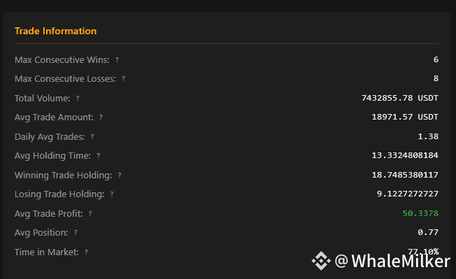 Despite promising performance ratios, a low win rate and short holding time hint at risk concentration.