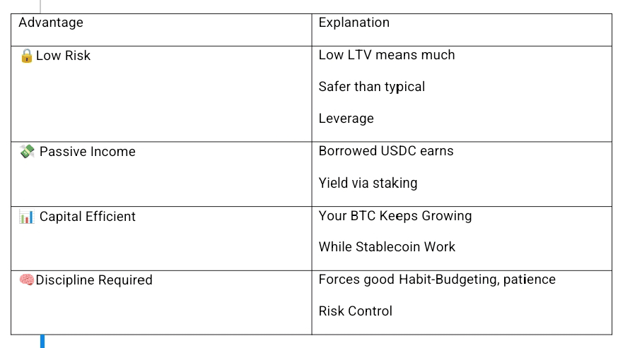Anstatt BTC untätig sitzen zu lassen, benutze ich es als Sicherheit, um USDC zu leihen, aber ich halte das Verhältnis von Darlehen zu Wert (LTV) niedrig – etwa 27–28%. Das gibt mir: