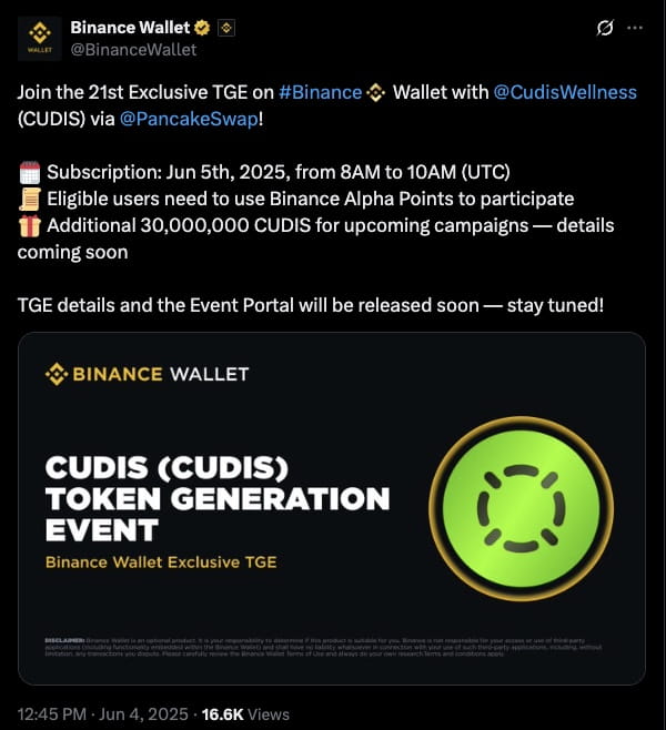 Binance hat auch eine bevorstehende Verteilung von 30.000.000 CUDIS-Token durch zusätzliche Kampagnen angekündigt, mit weiteren Details, die bald bekannt gegeben werden. Das TGE-Event-Portal und die vollständigen Teilnahmebedingungen werden über die offiziellen Kanäle von Binance veröffentlicht.
