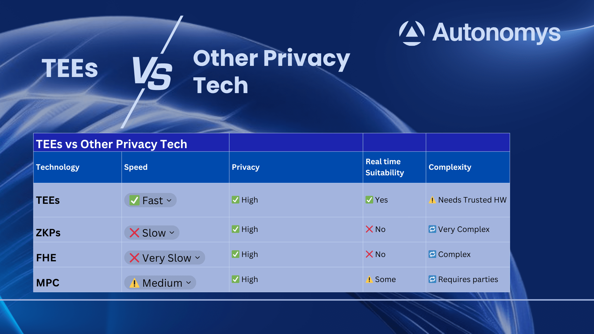 Im Gegensatz zu anderen datenschutzfördernden Technologien wie Zero-Knowledge-Proofs (ZKPs), vollhomomorpher Verschlüsselung (FHE) und Mehrparteienberechnung (MPC), die stark auf komplexe kryptografische Methoden angewiesen sind, bieten TEEs eine hardwarebasierte Lösung. Dieser Ansatz bietet ein Gleichgewicht zwischen Sicherheit und Leistung, was ihn besonders geeignet für Echtzeit-KI-Anwendungen macht.