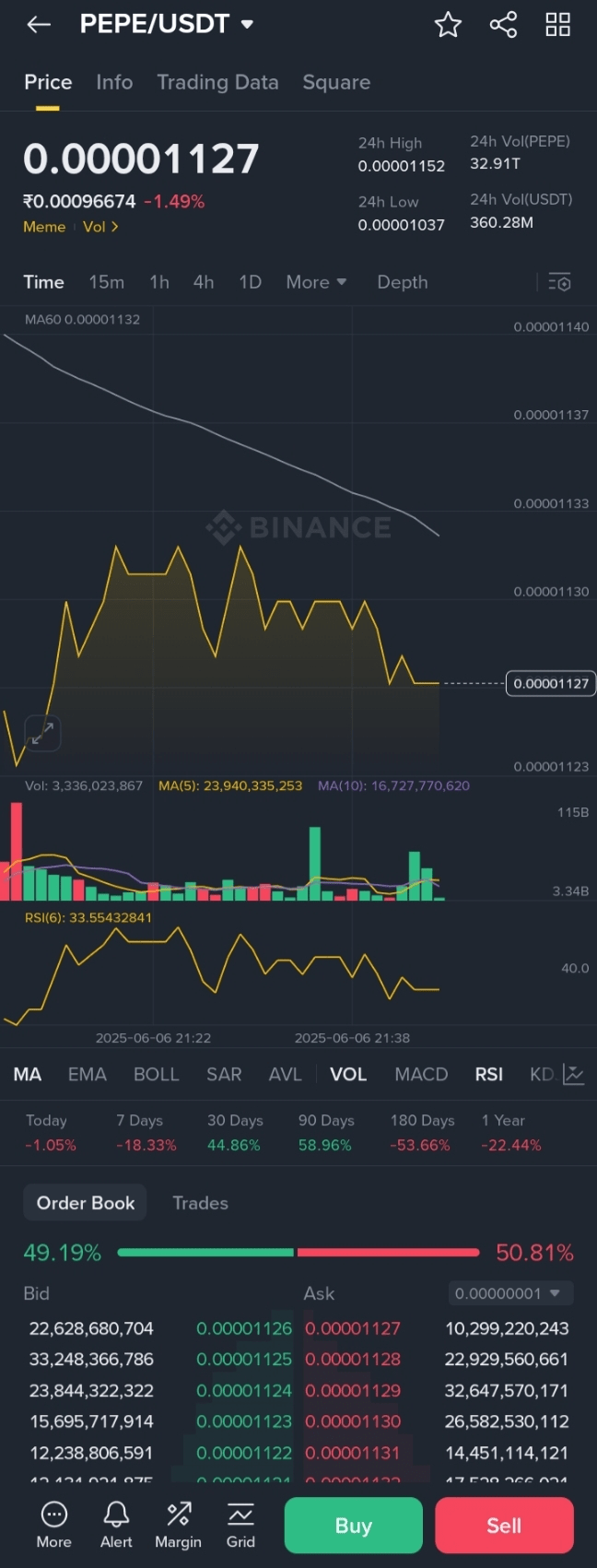 Preis & Bereich: Stand 7. Juni 2025 handelt PEPE nahe $1.12 × 10⁻⁹ und schwankt kürzlich zwischen $1.04 × 10⁻⁹ – $1.13 × 10⁻⁹.