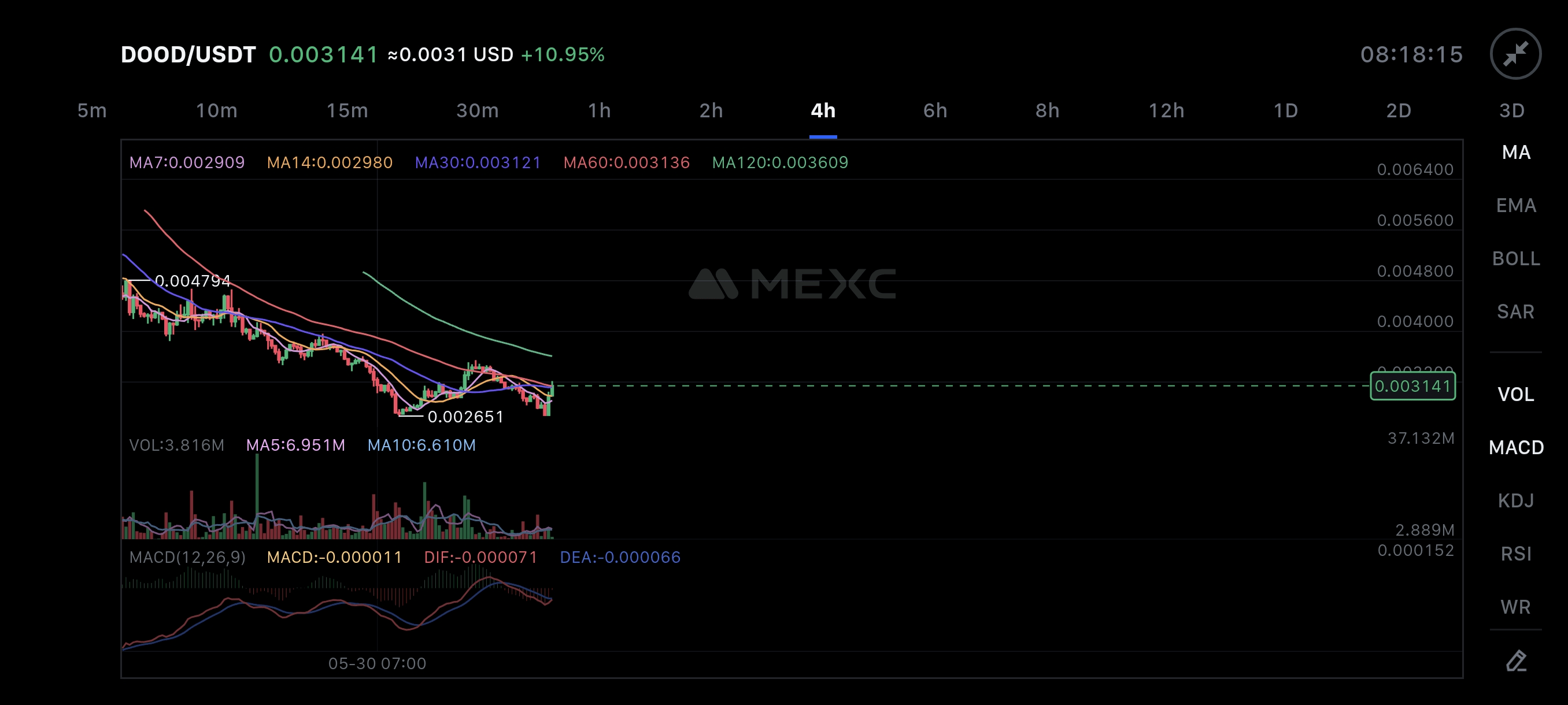 $DOOD Ich werde das DOOD/USDT-Diagramm im 4-Stunden-Zeitrahmen analysieren, das Sie bereitgestellt haben, und Empfehlungen für den Einstieg basierend auf dem aktuellen Trend geben.