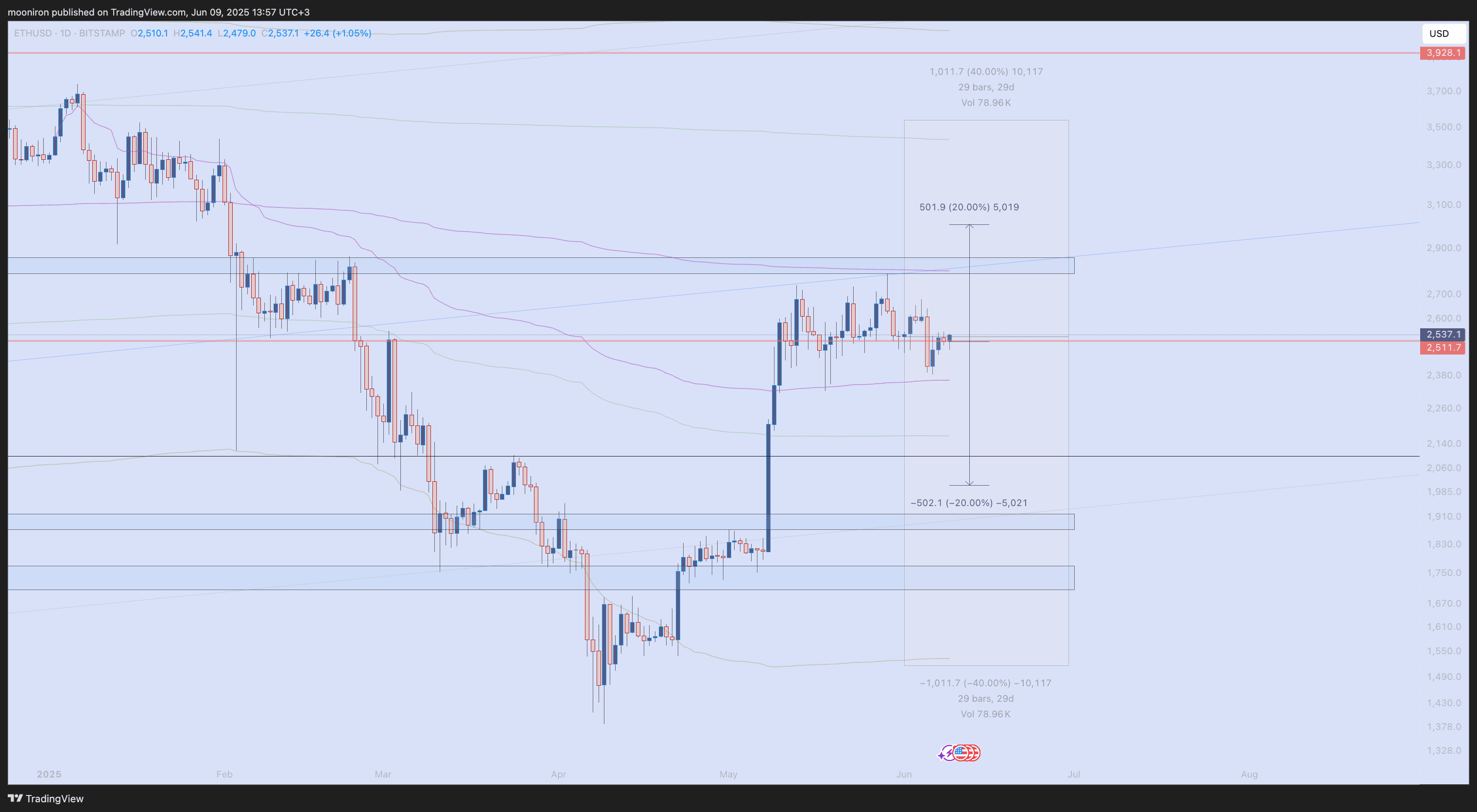 Ähnlich wie BTC, aber mit mehr Bewegung. Wöchentliche Schließungen haben sich in Form von Doji-Kerzen seit 4 Wochen geschlossen. Auch hier versucht es, ähnlich wie BTC, über 102k zu schließen und über 2500 zu halten.